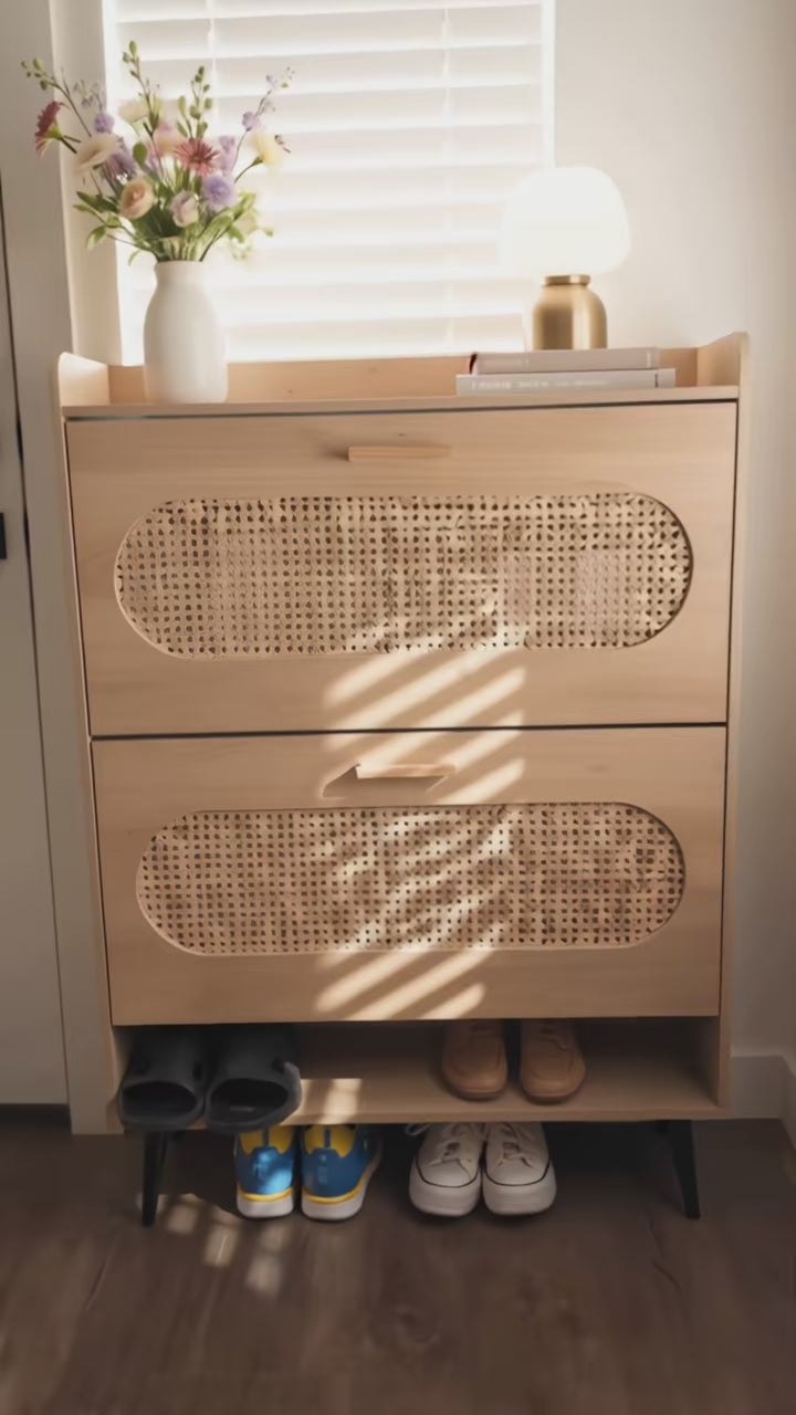 Introducing the Shoe Storage Cabinet – an elegant and practical solution for keeping your footwear organized and accessible. Crafted with care, this cabinet features a modern design with two flip drawers crafted from durable wood and rattan embellishments, making it a perfect addition to any hallway or entryway.